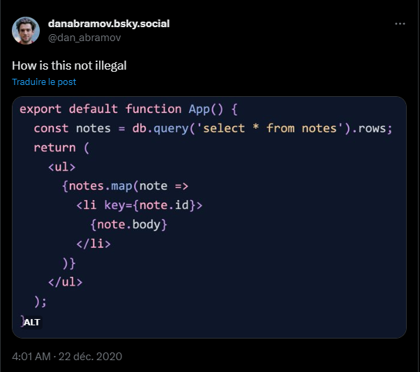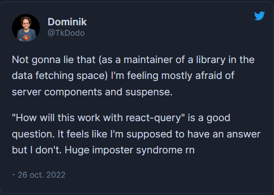 Since it was already difficult for me to wrap my head around all these new concepts and ways of thinking, I am definitely not the best person to explain it. Before making more mistakes while explaining it, I will let you read the Nextjs doc documentation, check out Dan Abramov tweets, and watch all the YouTube videos made by tech influencers.