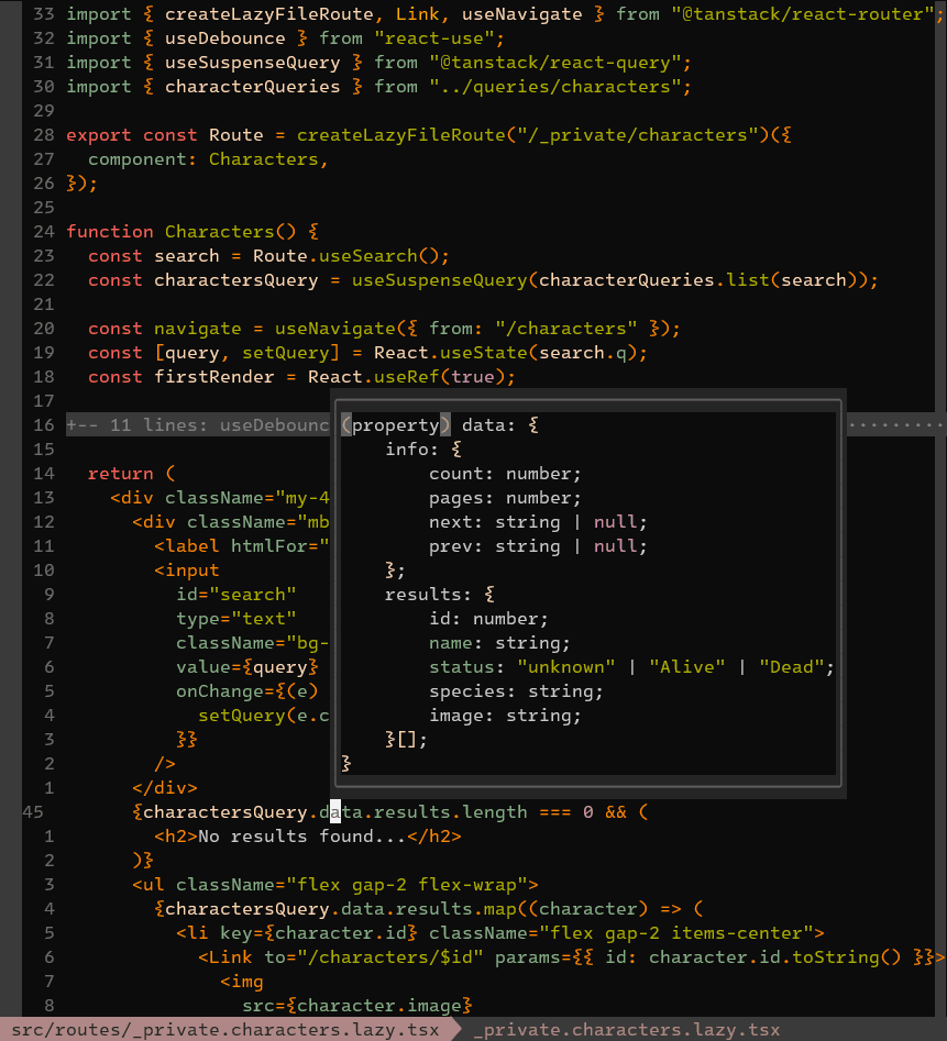 The first feature that caught my attention was the file-based routing. While code-based routing is also possible, the library recommends against it. Personally, I'm not a huge fan of the directory-centric approach in Next.js, so the flat routing structure here appealed to me. After experimenting with it, I realized that embedding data fetching, suspense fallback component , and error handling within route declarations could make code-based routing somewhat challenging to maintain.
